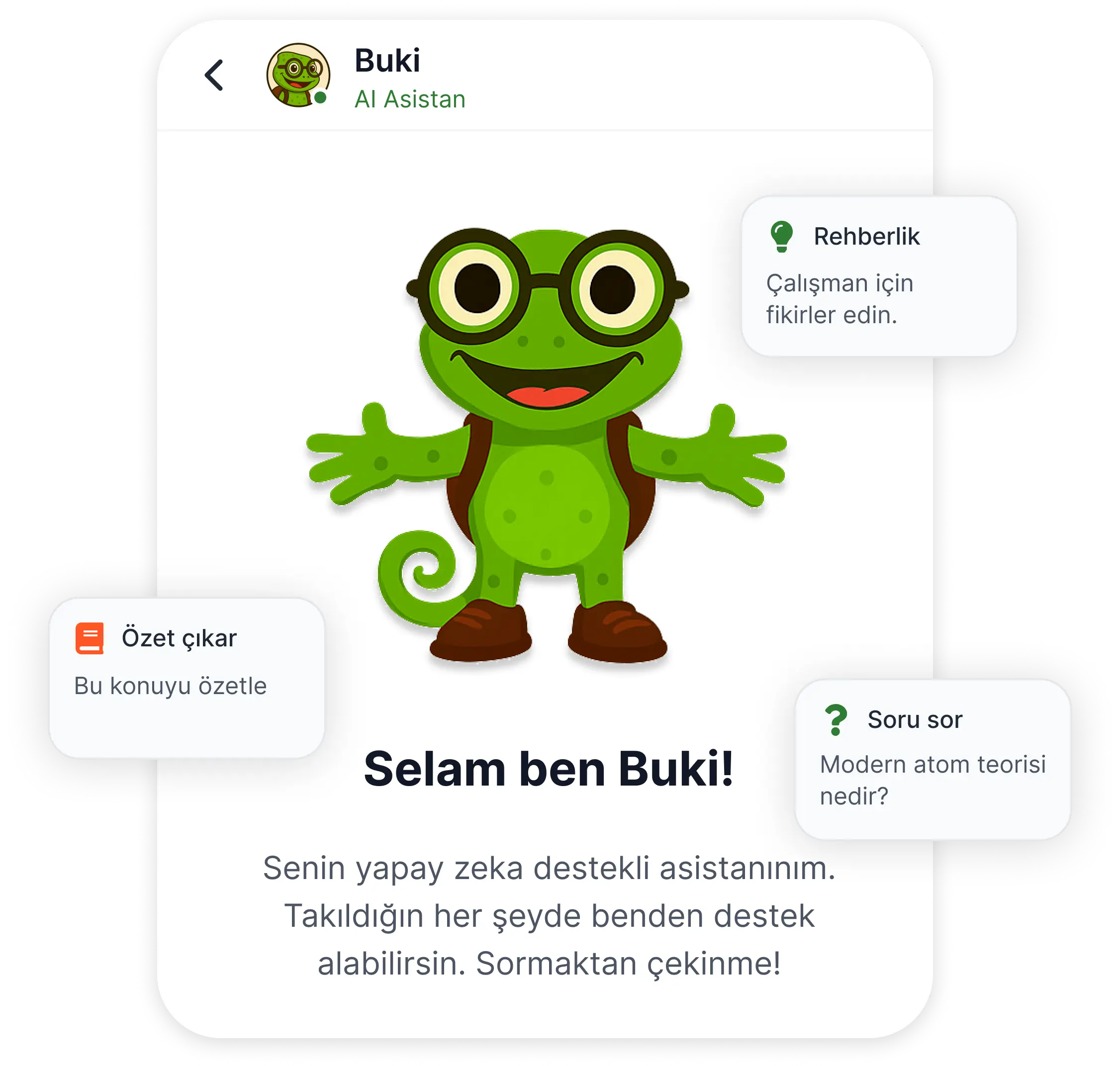 Sorularını biriktir, arkadaşlarınla çöz, AI asistanın Buki’yle asla cevapsız kalma. Kaydedersen unutulmaz, paylaşırsan çözülür.